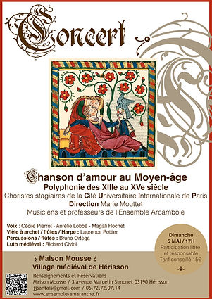 La Maison Mousse, ancienne résidence des Bourbons, située dans le petit village médiéval d'Hérisson (Allier) est restaurée avec passion et précision par Françoise Bardot et Jean-Jacques Santais. Ces murs séculaires ont accueillis une résidence de la Formation Arcambole du 2 au 6 novembre. Les musiciens de l'ensemble ont construit un programme espagnol autour du Livre Vermeil de Montserrat et des Cantigas de Santa Maria. La grande salle du château a accueilli un concert à la bougie et un public enthousiaste pour clôturer cette semaine de travail.